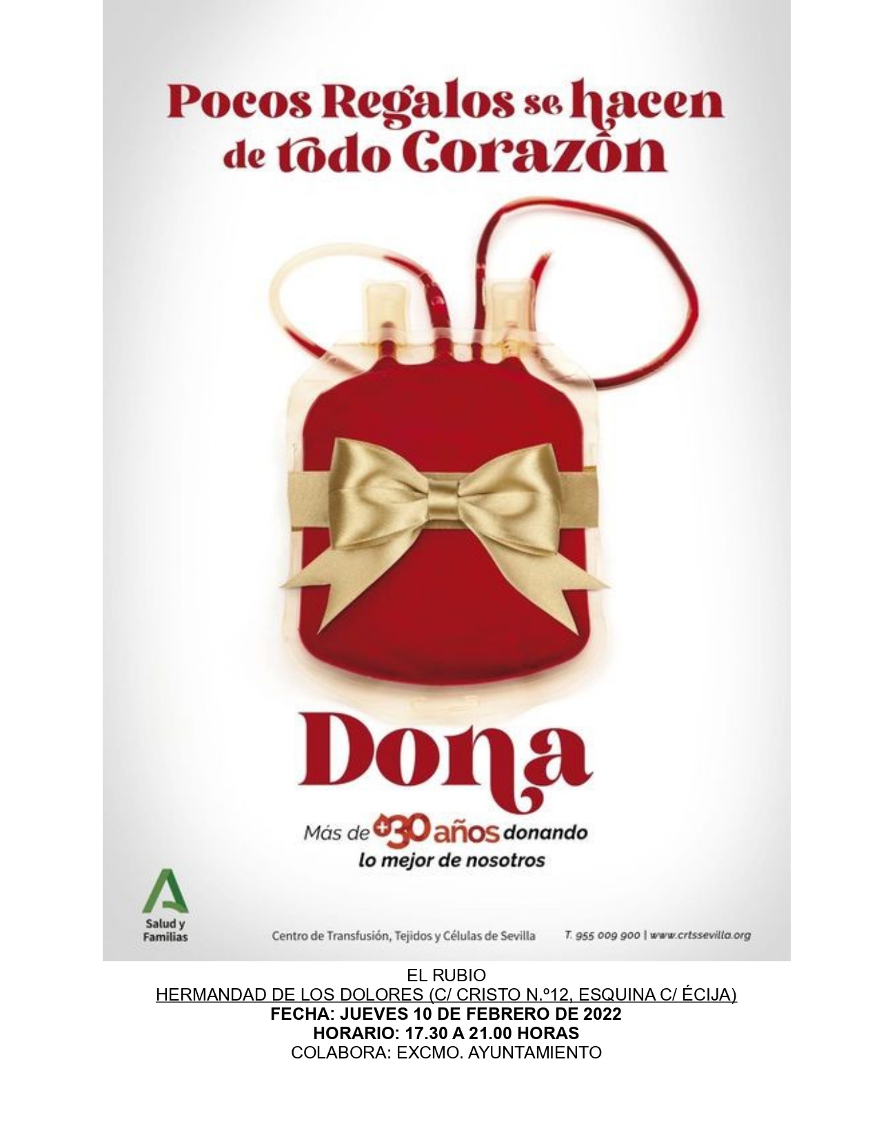 EL JUEVES 10 DE FEBRERO habrá una campaña de donación de sangre en EL RUBIO. Será LA HERMANDAD DE LOS DOLORES (C/ CRISTO 12 ESQUINA CON C/ ÉCIJA) en horario de 17.30 a 21.00 horas. Se necesita sangre de todos los grupos. COLABORA: EXCMO. AYUNTAMIENTO. Descargar http://crtssevilla.org/galeria.php?eid=799