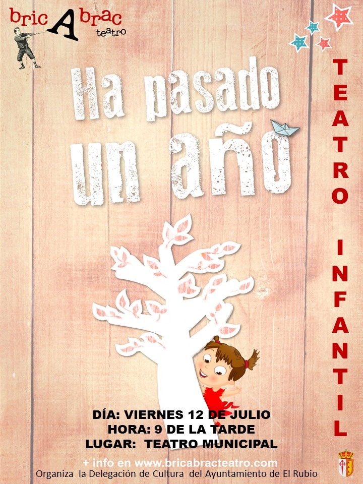 El Teatro Municipal de El Rubio acogerá el próximo viernes, 12 de julio, la obra "Ha pasado un año". Un espectáculo dirigido a todos los públicos, en especial a los más pequeños, de unos 40 minutos de duración y en donde las risas, estarán aseguradas. Se trata de una iniciativa que organiza la delegación de Cultura del ayuntamiento rubeño y la obra estará representada por la compañía bricAbrac Teatro. Será a partir de las 21:00 de la noche. ¡Apúntate!