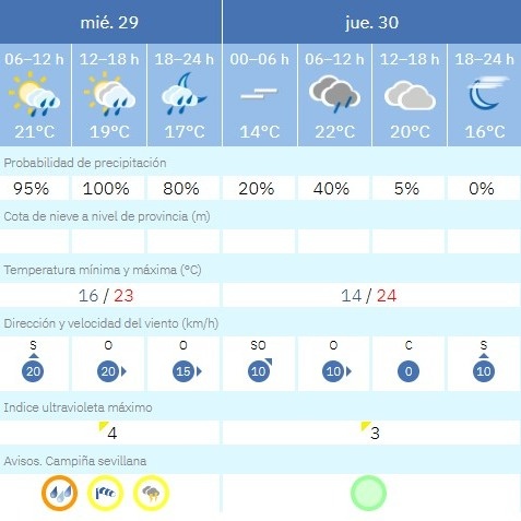 - Viento: Vientos del suroeste, con rachas máximas de 80km/h.