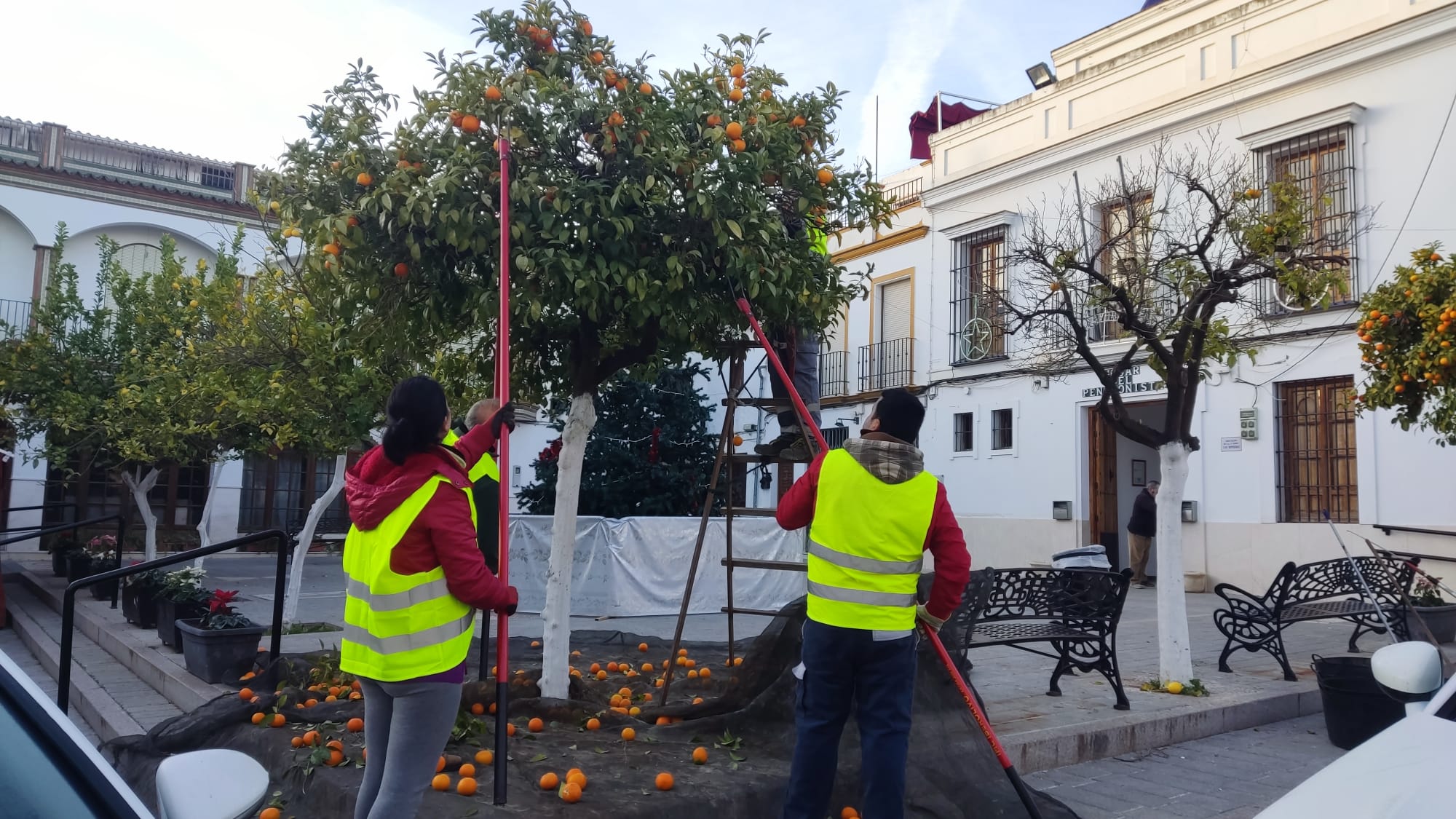 Hoy ha comenzado la campaña de recogida de naranja amarga en la localidad, los trabajos han iniciado esta mañana en la Plaza de España y continuarán en las calles, parques, plazas y paseos del municipio.