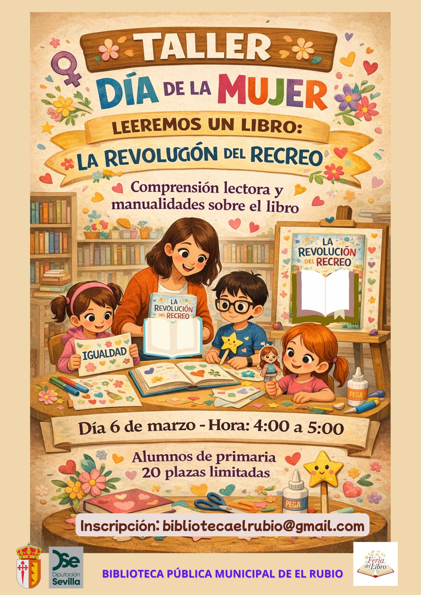 La BIBLIOTECA MUNICIPAL conmemora el Día de la Mujer mediante un taller donde se leerá "LA REVOLUCIÓN DEL RECREO" un cuento realizado desde la Delegación de Igualdad de la Diputación de Sevilla. Seguidamente, se llevará a cabo una comprensión lectora y se realizará una manualidad sobre el libro.