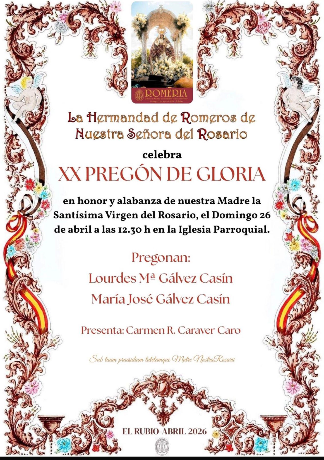 El próximo domingo 26 de abril a las 12:30h., se celebrará en la Parroquia de Ntra. Señora del Rosario de El Rubio el XX Pregón de Gloria en honor y alabanza a la Santísima Virgen del Rosario.