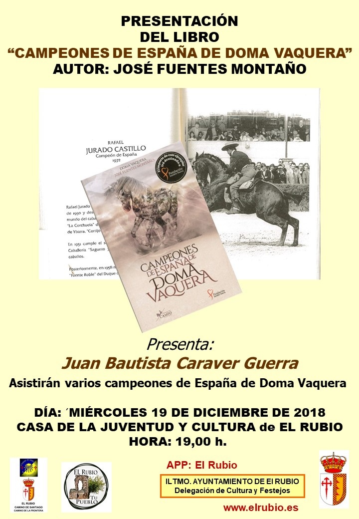 PRESENTACIÓN DEL LIBRO “CAMPEONES DE ESPAÑA DE DOMA VAQUERA” José Fuentes Montaño es el autor del libro “Campeones de España de Doma Vaquera”, que será presentado el próximo miércoles, día 19 de diciembre, en la Casa de la Juventud y Cultura de El Rubio. La cita tendrá lugar a partir de las 19:00 horas y el presentador del acto será Juan Bautista Caraver Guerra. Todos los rubeños y rubeñas que quieran, podrán asistir al evento, al que también acudirán varios campeones de España de esta modalidad de doma.