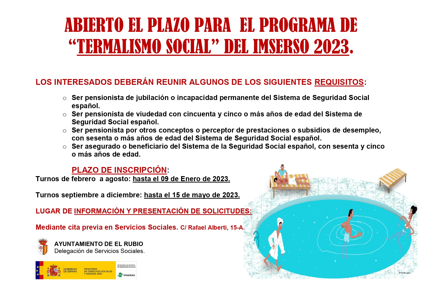 ABIERTO EL PLAZO PARA EL PROGRAMA DE ¿TERMALISMO SOCIAL¿ DEL IMSERSO 2023