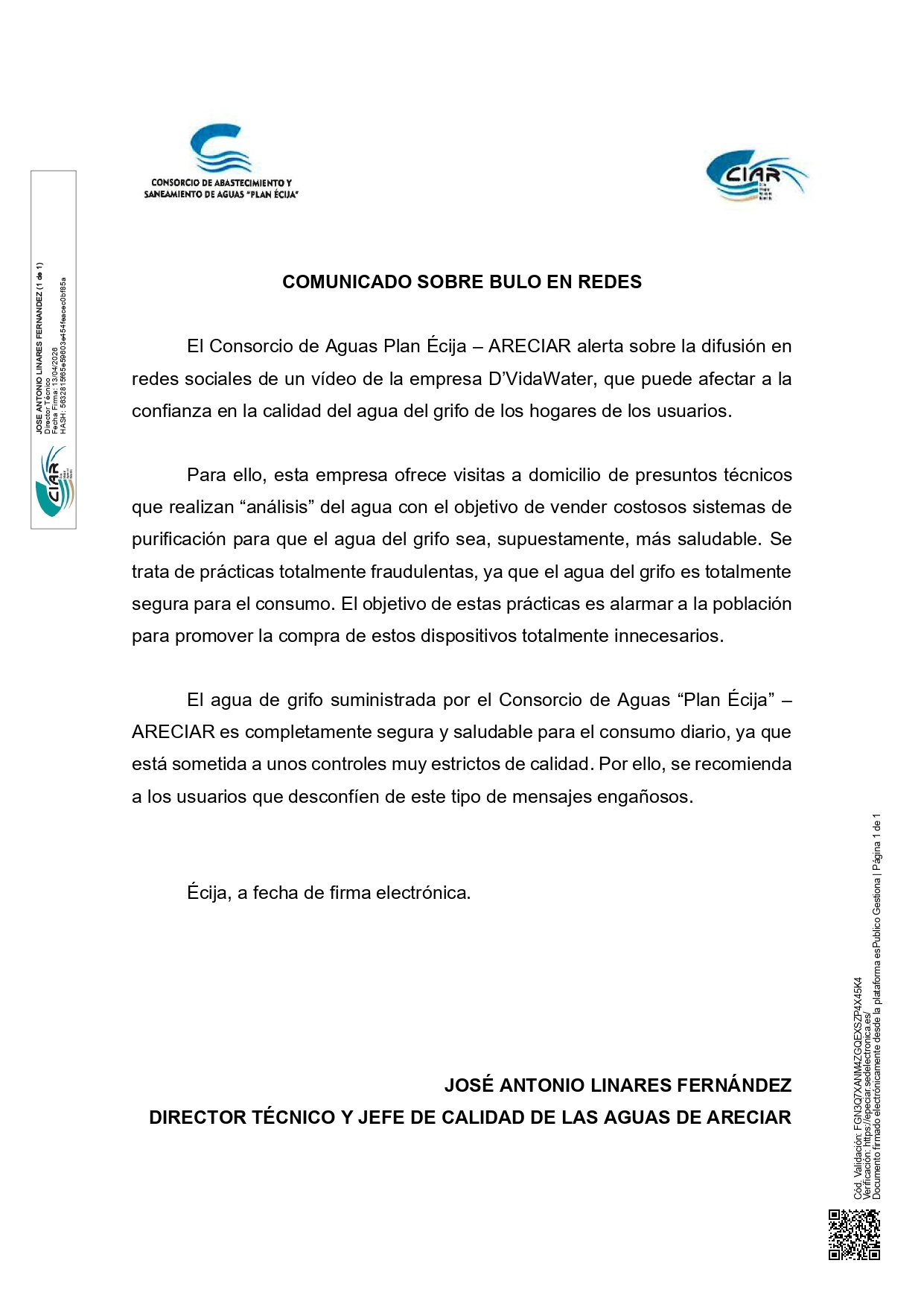 COMUNICADO CONSORCIO DE AGUAS PLAN ÉCIJA – ARECIAR