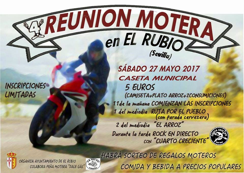 El sábado 27 se celebra la cuarta Reunión Motera de El Rubio, organizada por la Peña Motera ‘Dale Gas’ con la colaboración del Ayuntamiento de El Rubio.