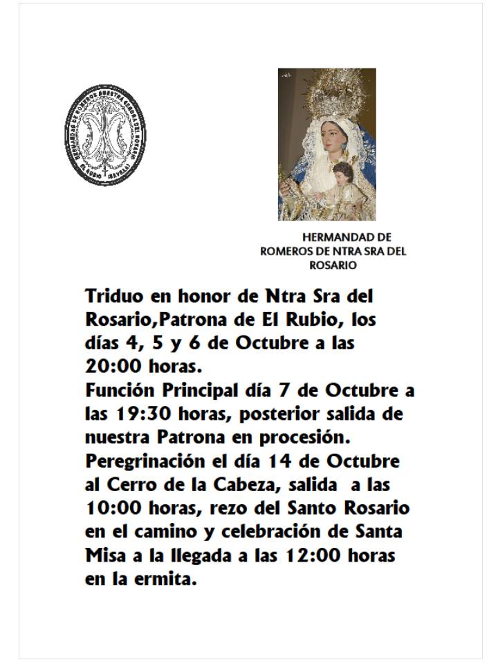 Triduo en honor de Ntra Sra del Rosario,Patrona de El Rubio, los días 4, 5 y 6 de Octubre a las 20:00 horas.