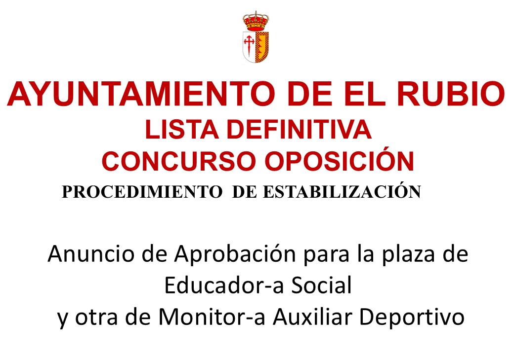 Lista Definitiva. Concurso Oposición. Listas definitivas de admitidos y excluidos, y nombramiento del Tribunal Calificador, en las convocatorias para la selección mediante el sistema de concurso Oposición de personal laboral fijo del Ayuntamiento de El Rubio para una plaza de Educador-a Social y otra de Monitor Auxiliar Deportivo