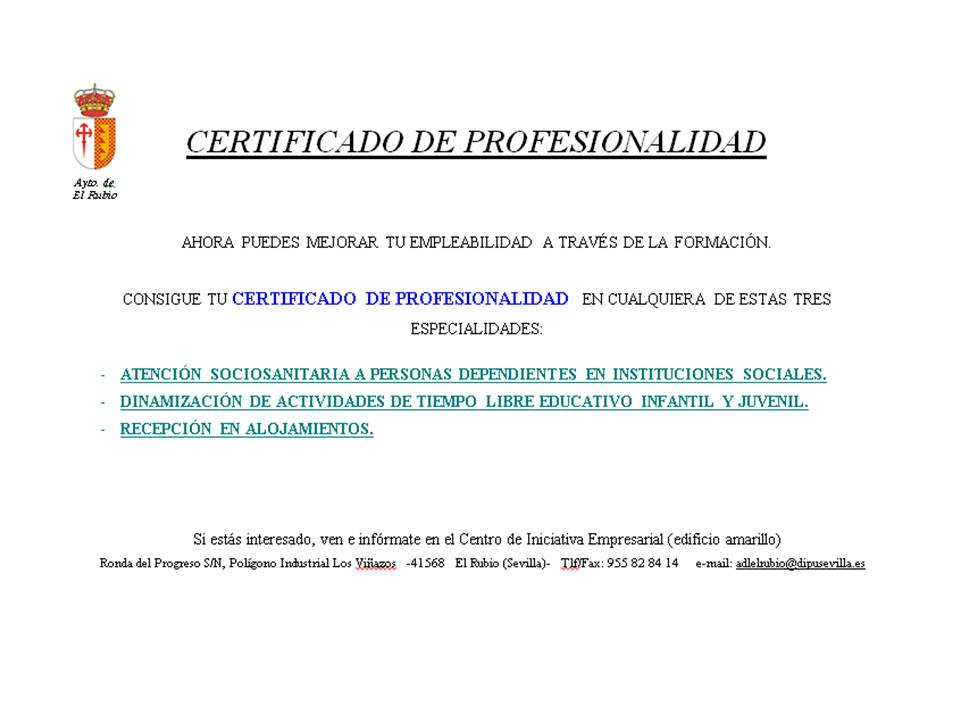Ronda del Progreso S/N, Polígono Industrial Los Viñazos -41568 El Rubio (Sevilla)- Tlf/Fax: 955 82 84 14 e-mail: adlelrubio@dipusevilla.es