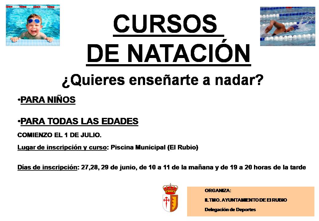 En las instalaciones de la Piscina Municipal de El Rubio, se va a comenzar un Curso de Natación que tendrá 2 categorías, una para niños que se dará en horario de tarde de 19.00 h a 20.00 h. y para todas las edades en horario de 10 a 11 de la mañana. El curso dará comienzo el 1 de julio.