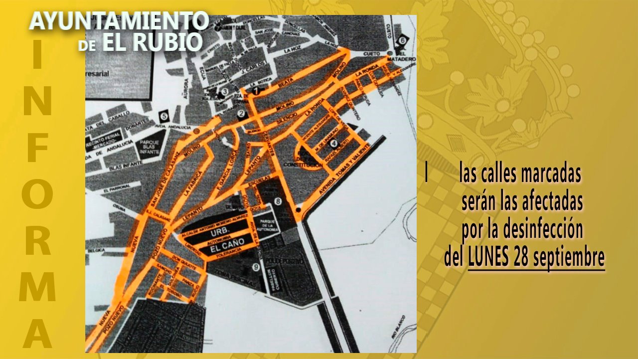 Una semana más, el próximo lunes 28 y el martes 29, el Ayuntamiento de El Rubio procederá a la desinfección de calles de forma manual con hipoclorito sódico. El horario estimado será de 7 de la mañana a 12 y las calles afectadas serán las marcadas en los planos adjuntos.