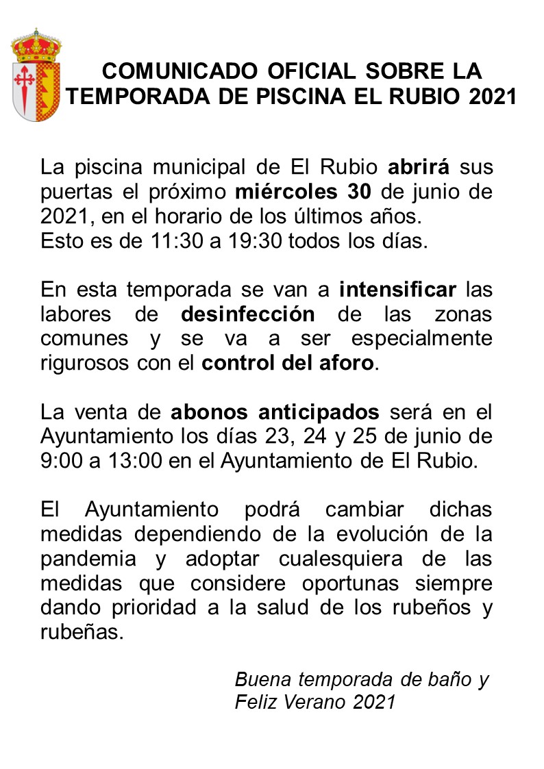 COMUNICADO OFICIAL SOBRE LA TEMPORADA DE PISCINA EL RUBIO 2021 |