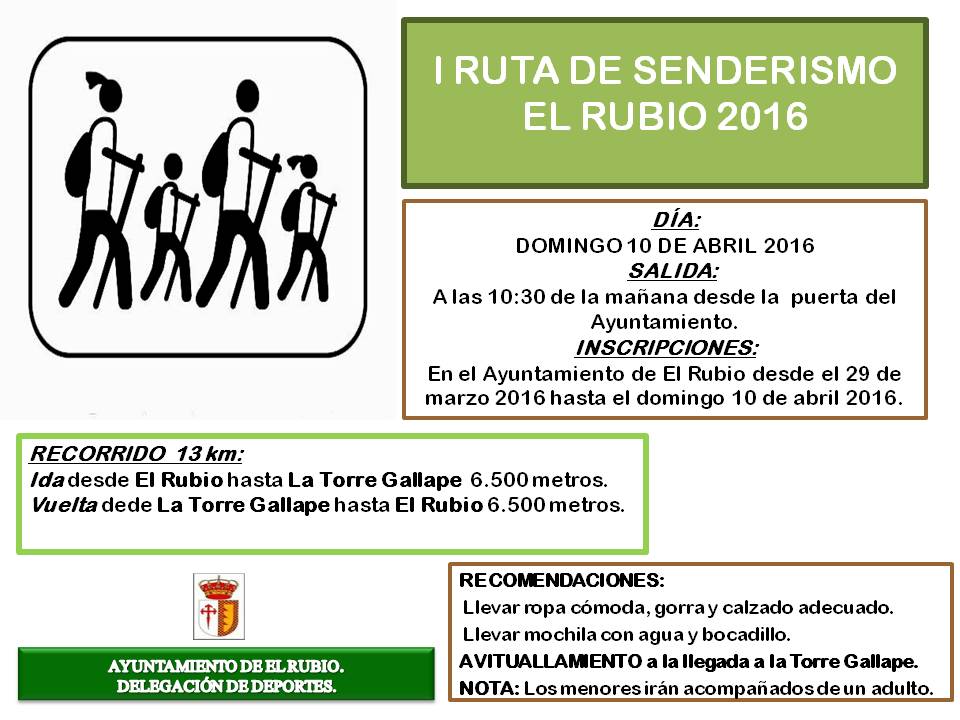 Organizada por la Delegación de Deportes del Ayuntamiento El Rubio, la I Ruta de Senderismo en El Rubio va a unir este domingo el municipio rubeño con la Torre Gallape, en un recorrido de trece kilómetros entre ambos puntos, ida y vuelta.
