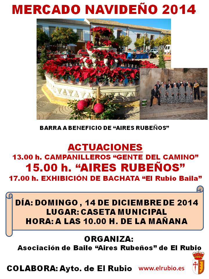 La Asociación de Baile “Aires Rubeños” de El Rubio organiza para este domingo, día 14, un Mercado Navideño en el que se instalará una barra cuya recaudación se destinará a esta entidad y en el que habrá también música y baile, ha informado el Ayuntamiento local, colaborador de esta iniciativa.
