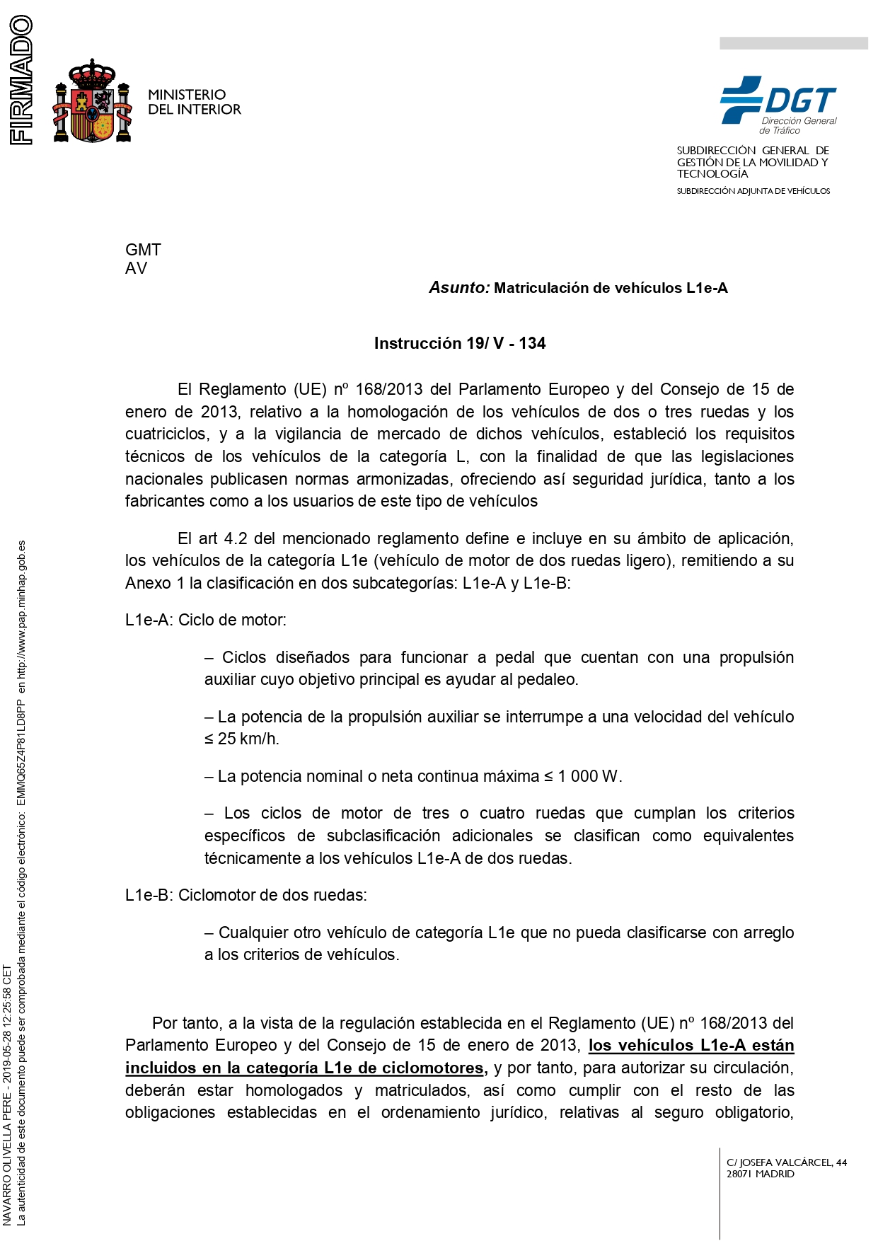 Vehículo de motor de 2 ruedas Reglamento (UE) 168/2013 Instrucción 19/V-134 |