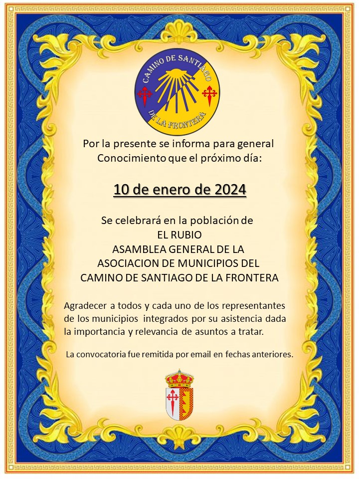 El miércoles, 10 de enero de 2024, en la Casa de la Juventud y Cultura de El Rubio estarán convocados 34 representantes de los Ayuntamientos de la provincia de Sevilla, a la ASAMBLEA GENERAL DE LA ASOCIACIÓN DE MUNICIPIOS DEL CAMINO DE SANTIAGO DE LA FRONTERA.
