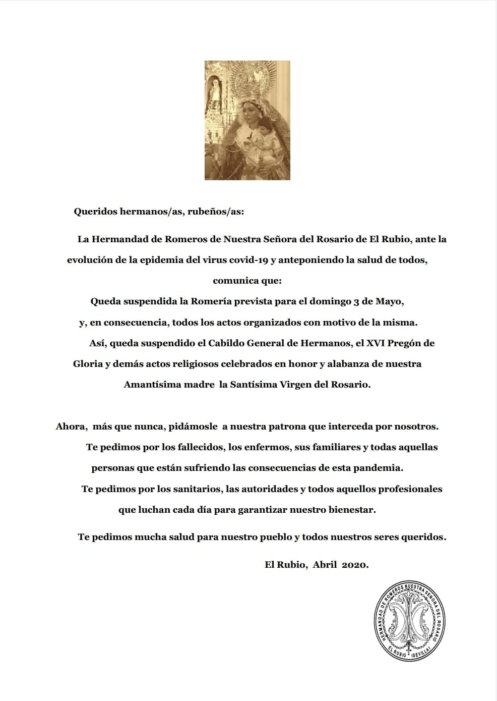 SUSPENDIDA LA ROMERÍA DE NUESTRA SEÑORA DEL ROSARIO DE EL RUBIO