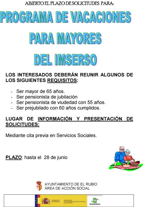El área de Acción Social de nuestro ayuntamiento abre el plazo de solicitudes para inscribirse en el Programa de Vacaciones para Mayores del Imserso.