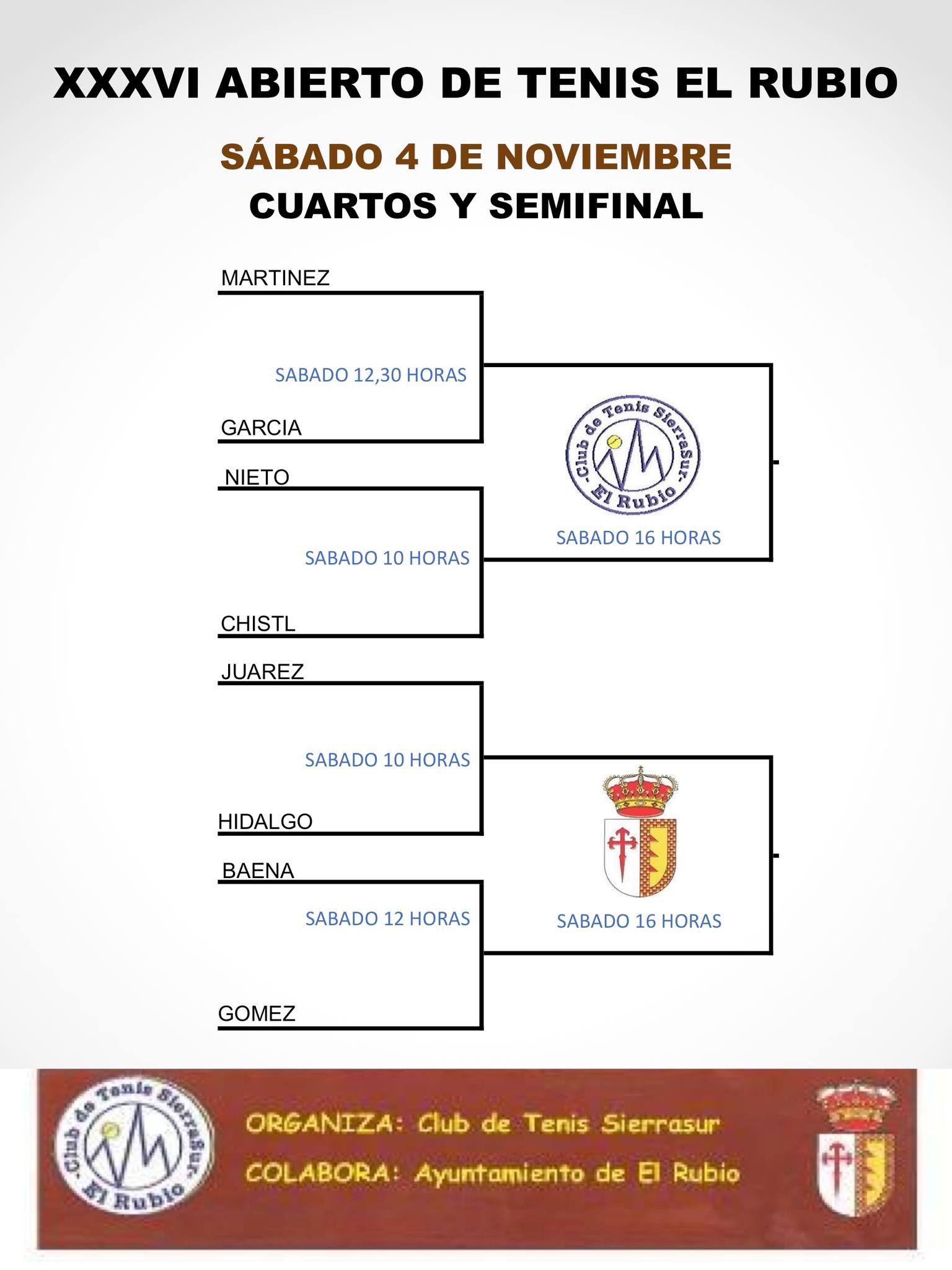 - El sábado 4 de noviembre a partir de las 10 de la mañana darán comienzo los cuartos de final y a partir de las 4 de la tarde se jugarán las dos semifinales.