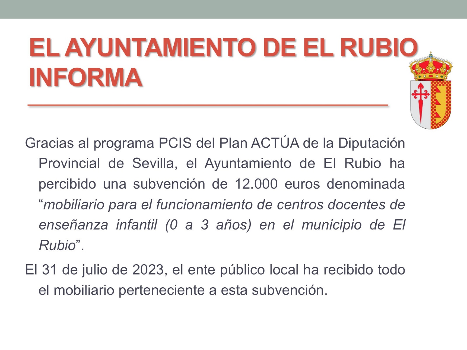 Gracias al programa PCIS del Plan ACTÚA de la Diputación Provincial de Sevilla, el Ayuntamiento de El Rubio ha percibido una subvención de 12.000 euros denominada “mobiliario para el funcionamiento de centros docentes de enseñanza infantil (0 a 3 años) en el municipio de El Rubio”. El 31 de julio de 2023, el ente público local ha recibido todo el mobiliario perteneciente a esta subvención.