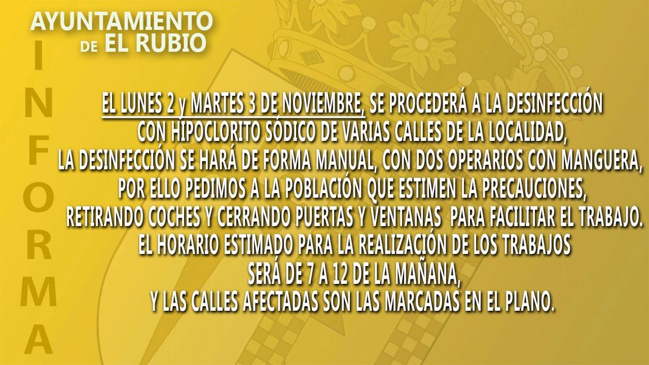 El Ayuntamiento de El Rubio informa que el próximo lunes 2 y martes 3 de noviembre se procederá a la desinfección de las calles del municipio