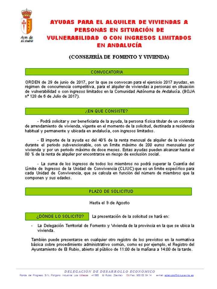 AYUDAS PARA EL ALQUILER DE VIVIENDAS A PERSONAS EN SITUACIÓN DE VULNERABILIDAD O CON INGRESOS LIMITADOS EN ANDALUCÍA (CONSEJERÍA DE FOMENTO Y VIVIENDA)