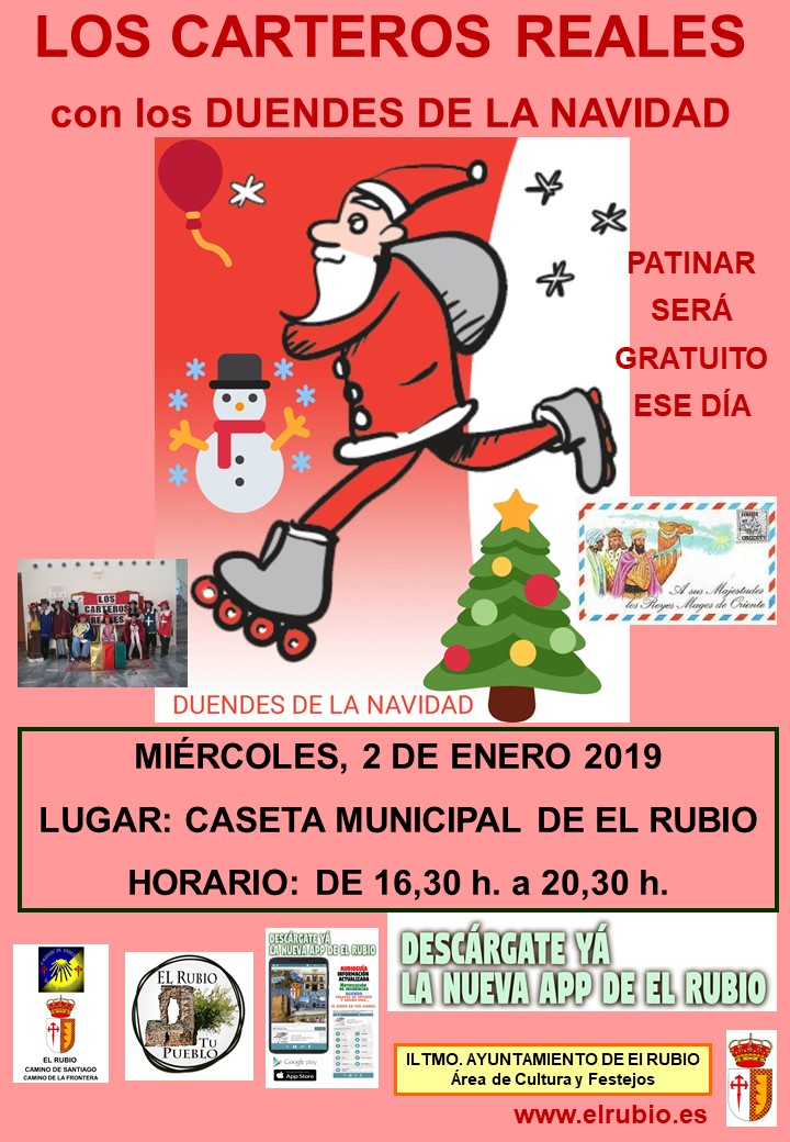 LOS CARTEROS REALES CON LOS DUENDES DE LA NAVIDAD. MIÉRCOLES, 2 DE ENERO 2019 LUGAR: CASETA MUNICIPAL DE EL RUBIO HORARIO: DE 16,30 h. a 20,30 h. PATINAR SERÁ GRATUITO ESE DÍA